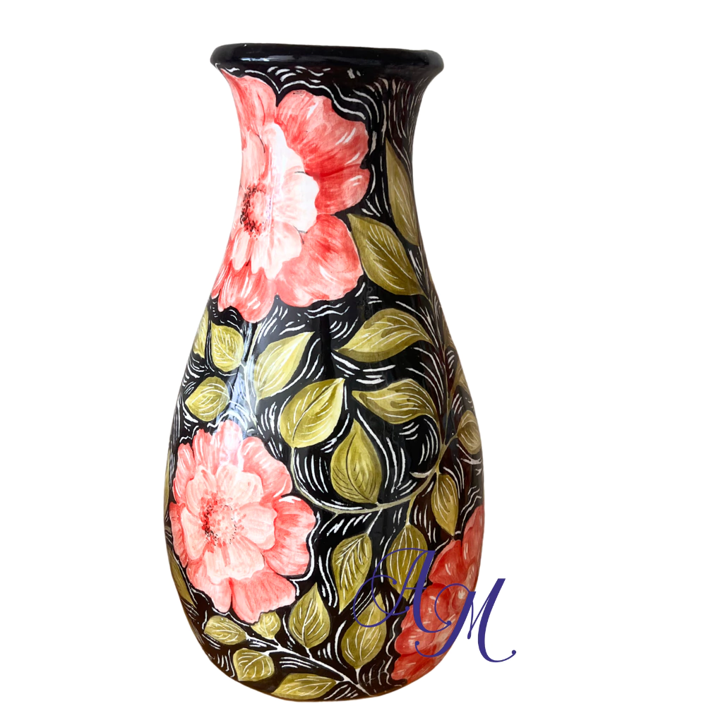 Una explosión de flores rosas se despliega con elegancia sobre un fondo negro profundo, creando un contraste vibrante y sofisticado. Este florero de cerámica pintado a mano celebra la belleza de lo femenino y lo salvaje, en una pieza que combina lo clásico con un aire contemporáneo. Ideal para destacar cualquier espacio con fuerza y delicadeza a la vez.